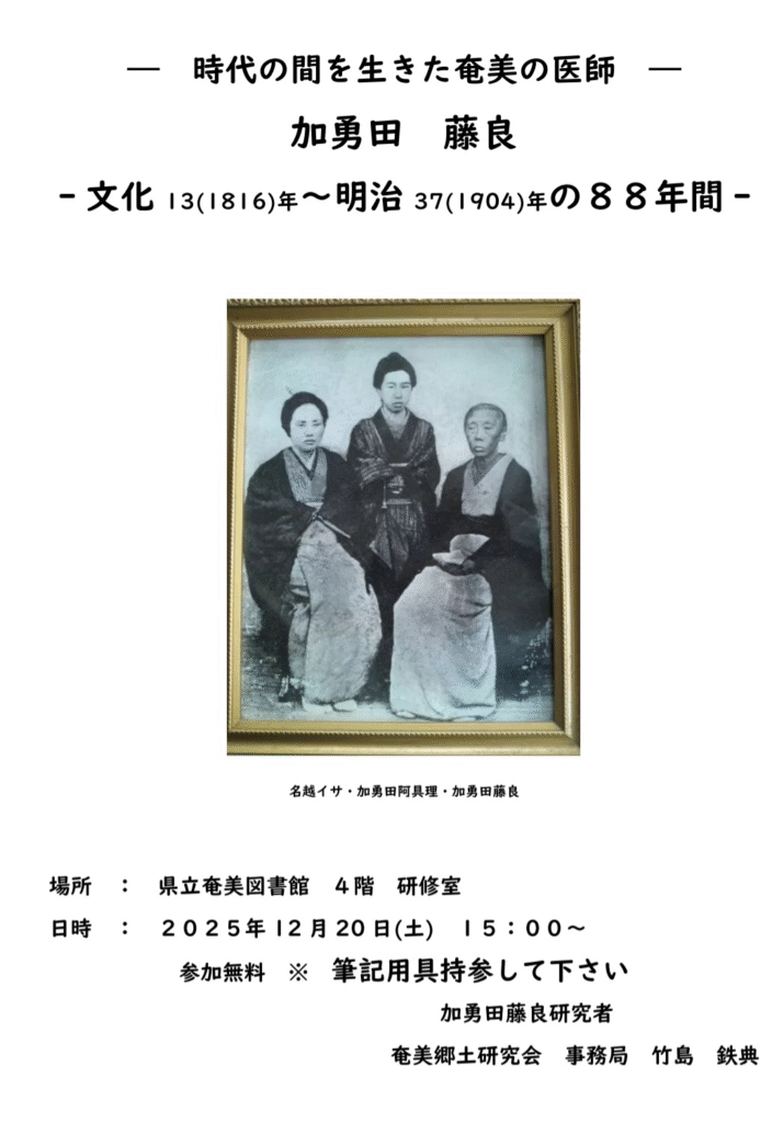 大島郡医師会50周年記念誌 翔(かける)2007年 限定数販売の中(104~119頁)に、『学術資料』 藩政末期~明治前期の医師「加勇田 藤良」物語として掲載された。